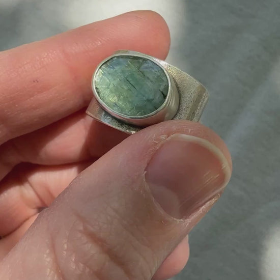 Teal blue kyanite saddle ring set with a textured band and matte-finished bezel setting. The wide band is tapered in back for comfort.